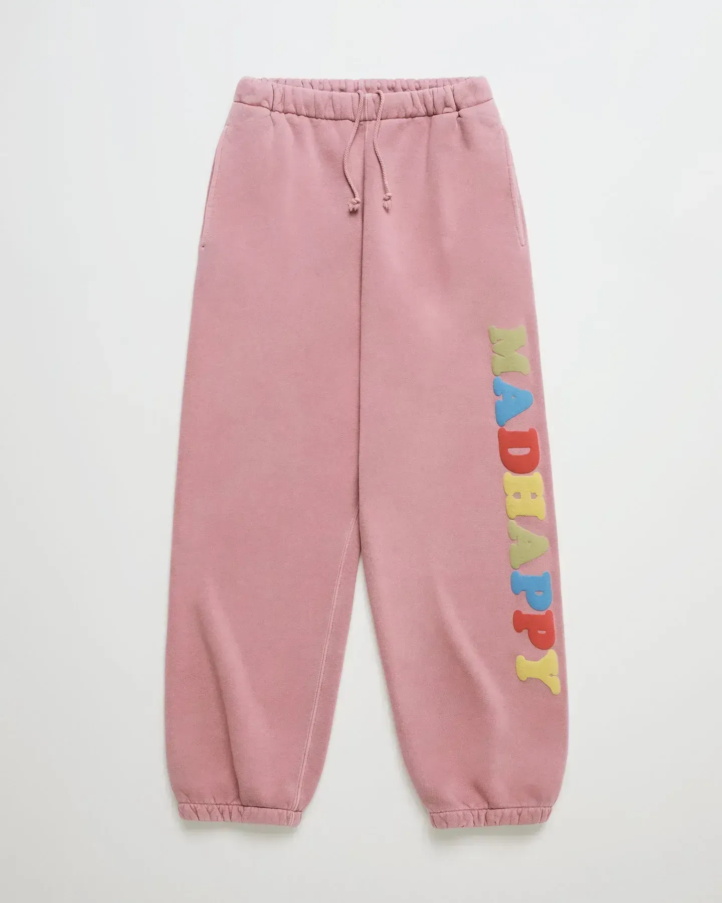 Another defining feature of Madhappy sweatpants is their subtle branding. Instead of overwhelming graphics, most designs feature clean embroidery or small logo placements. The brand name or optimistic slogans are often stitched delicately on the thigh, offering recognition without excess.