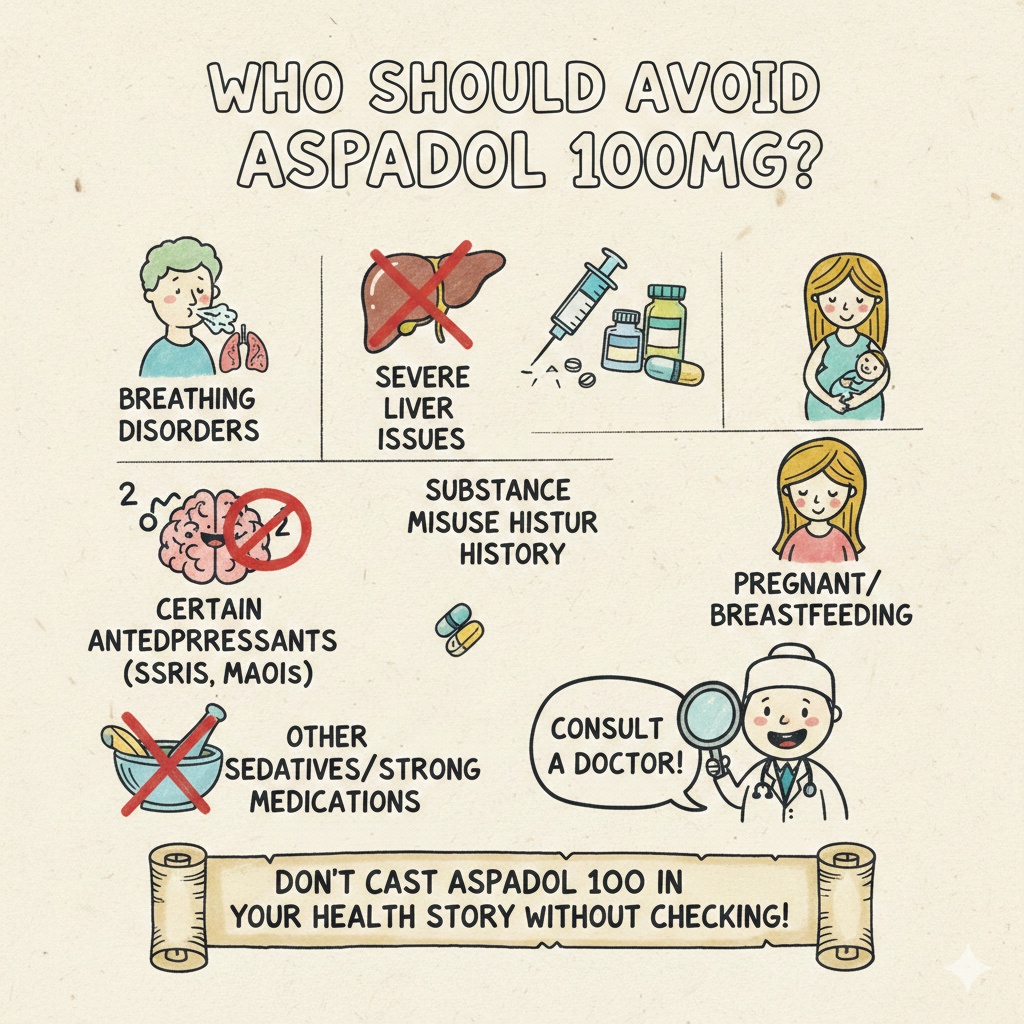 Not everyone is a suitable candidate for Aspadol tab 100mg (Tapentadol drugs). It is generally not recommended for individuals with severe respiratory conditions, uncontrolled asthma, or significant liver or kidney impairment without medical evaluation. Pregnant or breastfeeding women should consult a healthcare provider before use.