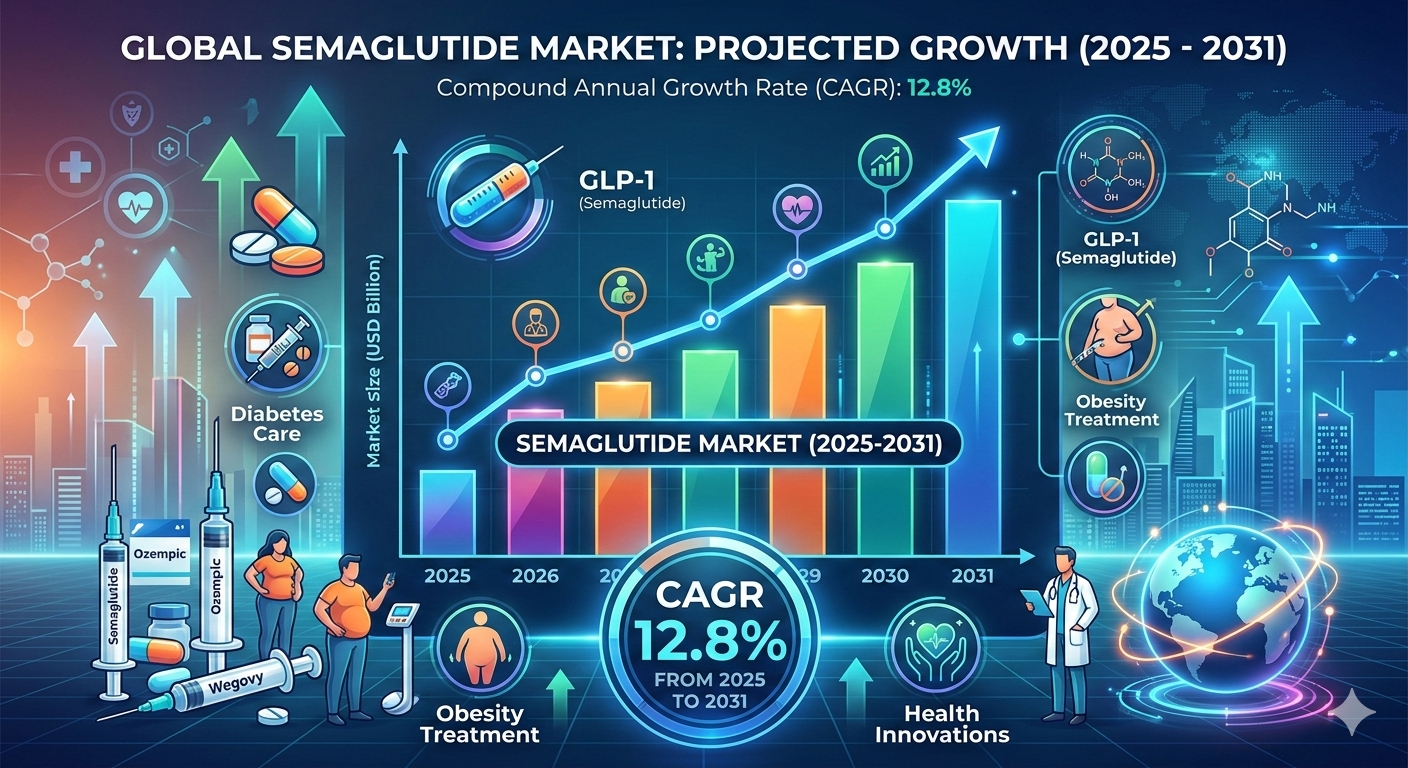 The Semaglutide Market is expected to register a CAGR of 12.8% from 2025 to 2031, with a market size expanding from US$ XX million in 2024 to US$ XX Million by 2031. The growing focus on chronic disease management, combined with advancements in pharmaceutical biotechnology, is positioning semaglutide as a key therapeutic solution in modern healthcare. Increasing awareness among patients and healthcare professionals continues to support widespread adoption and sustained commercial growth.