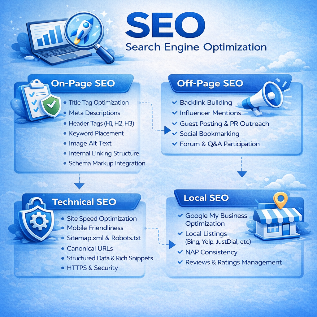Search Engine Optimization (SEO) is the foundation of digital marketing success. SEO focuses on improving your website’s visibility in organic search results when customers search for relevant keywords.