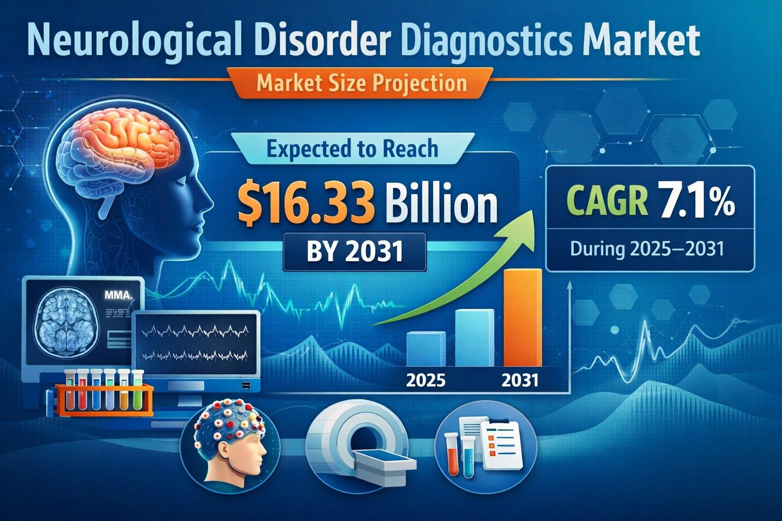 The Neurological Disorder Diagnostics Market is projected to reach US$ 16.33 billion by 2031, registering a CAGR of 7.1% during 2025 to 2031. The industry is witnessing steady expansion due to the growing prevalence of neurological conditions such as genetic neurological disorders, immunological neurological disorders, paraneoplastic syndrome, and paraproteinemic neuropathies. Rising awareness about early disease identification and the increasing burden of age related neurological conditions are significantly contributing to demand for advanced diagnostic technologies.