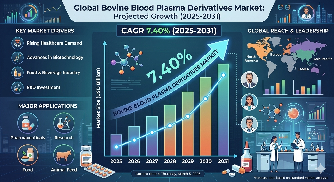 The Bovine Blood Plasma Derivatives Market is expected to register a CAGR of 7.40% from 2025 to 2031, expanding from US$ XX million in 2024 to US$ XX million by 2031. These derivatives are widely used across pharmaceutical, biotechnology, and research applications due to their rich protein composition and biological activity. Growing demand for advanced biological ingredients in therapeutic development is supporting market expansion.