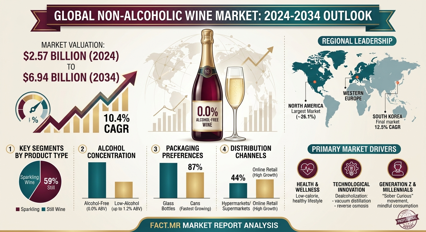 The global non-alcoholic wine market is positioned for a decade of high-velocity growth, with its valuation expected to rise from USD 2.84 billion in 2025 to USD 7.64 billion by 2035. This expansion, occurring at a compound annual growth rate (CAGR) of 10.4%, is fueled by a profound shift toward "sober-curious" lifestyles and the integration of advanced dealcoholization technologies that preserve the sensory integrity of traditional vintages.