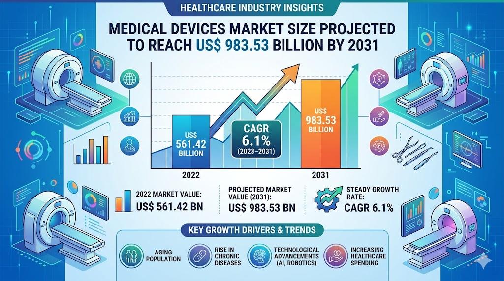The global medical devices industry is undergoing significant growth as healthcare systems worldwide prioritize early disease detection, improved patient management, and advanced therapeutic solutions. The Medical Devices Market is projected to reach US$ 983.53 billion by 2031 from US$ 561.42 billion in 2022, registering a CAGR of 6.1% during 2023–2031. The market expansion is fueled by multiple factors, including chronic disease prevalence, aging populations, technological advancements, and infrastructure development. Understanding these factors provides critical insights into growth opportunities and the overall industry impact.