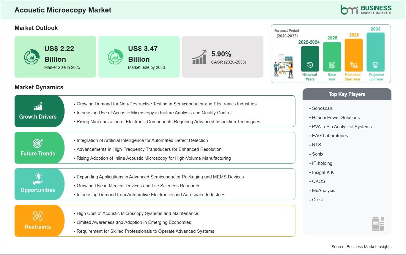 According to the Business Market Insights The Global Acoustic Microscopy Market is poised for significant expansion through 2033, driven by ever‑growing needs for precision imaging, non‑destructive evaluation, and advanced defect analysis across multiple high‑tech industries. Acoustic microscopy—which uses high‑frequency sound waves to visualize subsurface features without damaging the specimen—has become indispensable in semiconductor fabrication, materials research, biomedical laboratories, and quality control environments. According to market estimates, the global acoustic microscopy market size is projected to grow from US$ 2.22 billion in 2025 to approximately US$ 3.47 billion by 2033, reflecting a compound annual growth rate (CAGR) of ~5.9% between 2026 and 2033.