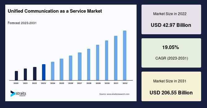 According to StraitsResearch, the global unified communication as a service market size was valued at USD 42.97 billion in 2022 and is estimated to reach USD 206.55 billion by 2031, growing at a CAGR of 19.05% during 2023-2031.