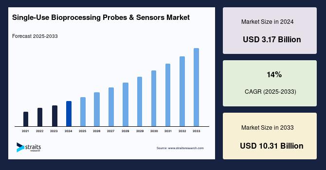 According to StraitsResearch, the global single use bioprocessing probes and sensors market size was valued at USD 3.17 billion in 2024 and is estimated to reach USD 10.31 billion by 2033, growing at a CAGR of 14% during 2025-2033.