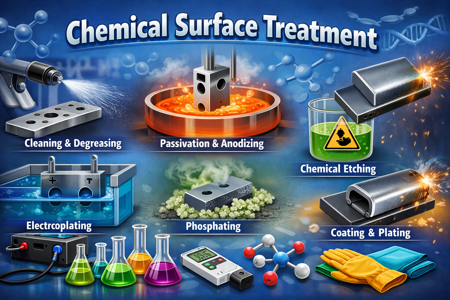 Chemical surface treatment is the application of chemical processes to improve surface properties, including corrosion resistance, wear resistance, adhesion, and overall durability.