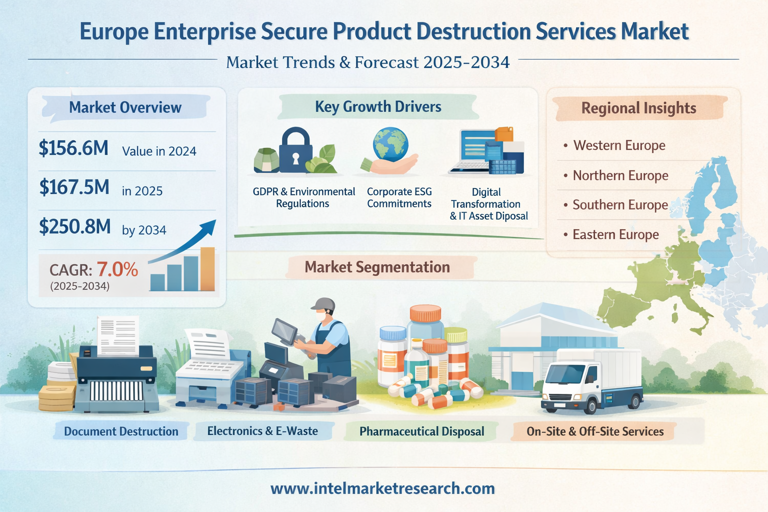 According to a new report from Intel Market Research, the Europe Enterprise Secure Product Destruction Services market was valued at USD 156.6 million in 2024 and is projected to grow from USD 167.5 million in 2025 to USD 250.8 million by 2034, exhibiting a robust CAGR of 7.0% during the forecast period (2025–2034). This growth is propelled by the region's stringent data privacy regulations, accelerating corporate ESG commitments, and the expanding scope of compliance-driven asset disposal across industries ranging from pharmaceuticals to financial services and electronics.