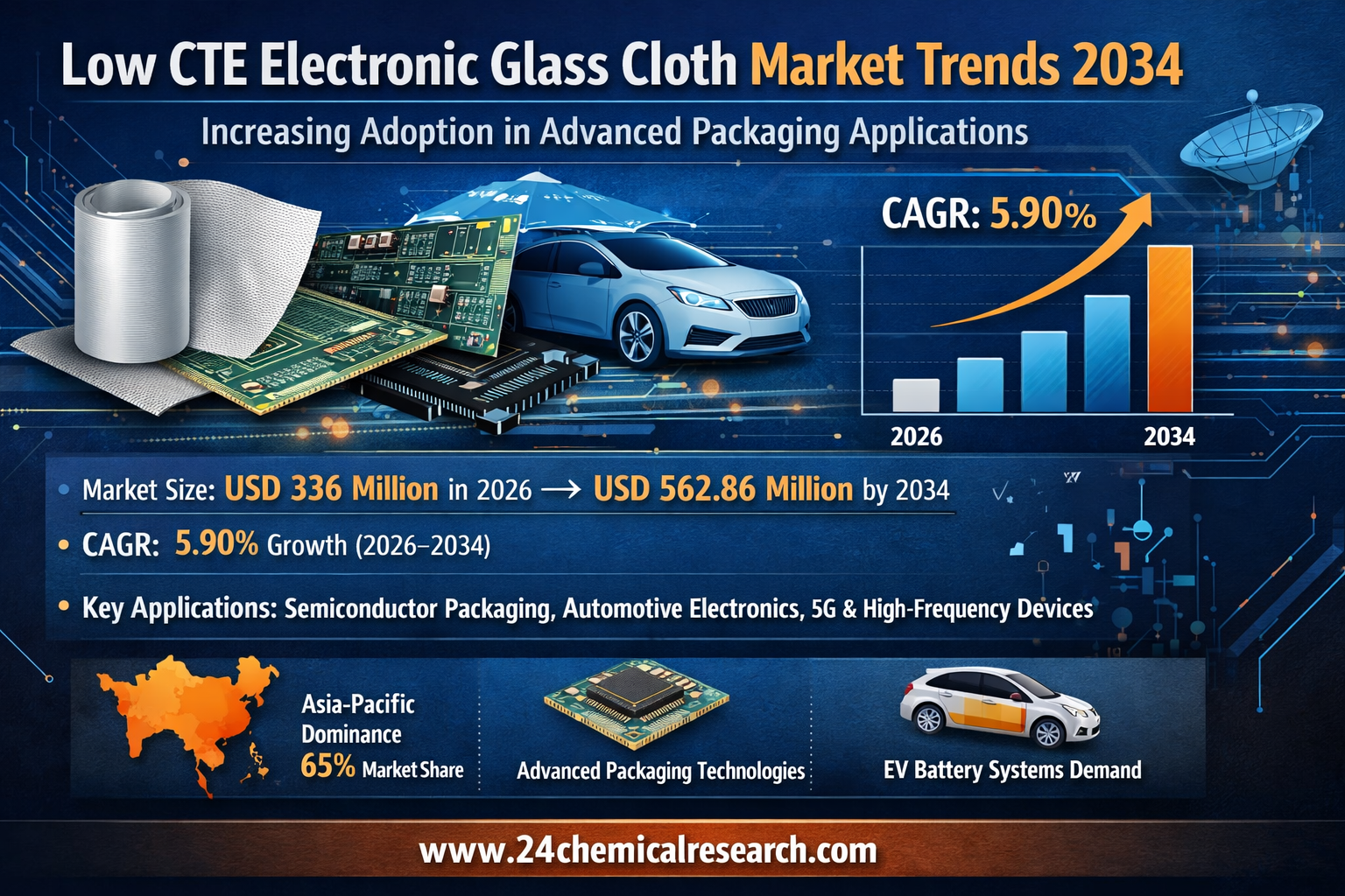 Global Low CTE Electronic Glass Cloth market was valued at USD 336 million in 2026 and is projected to reach USD 562.86 million by 2034, growing at a CAGR of 5.90% during the forecast period. This growth trajectory reflects increasing demand in semiconductor packaging, automotive electronics, and high-frequency communication applications where thermal stability is paramount.