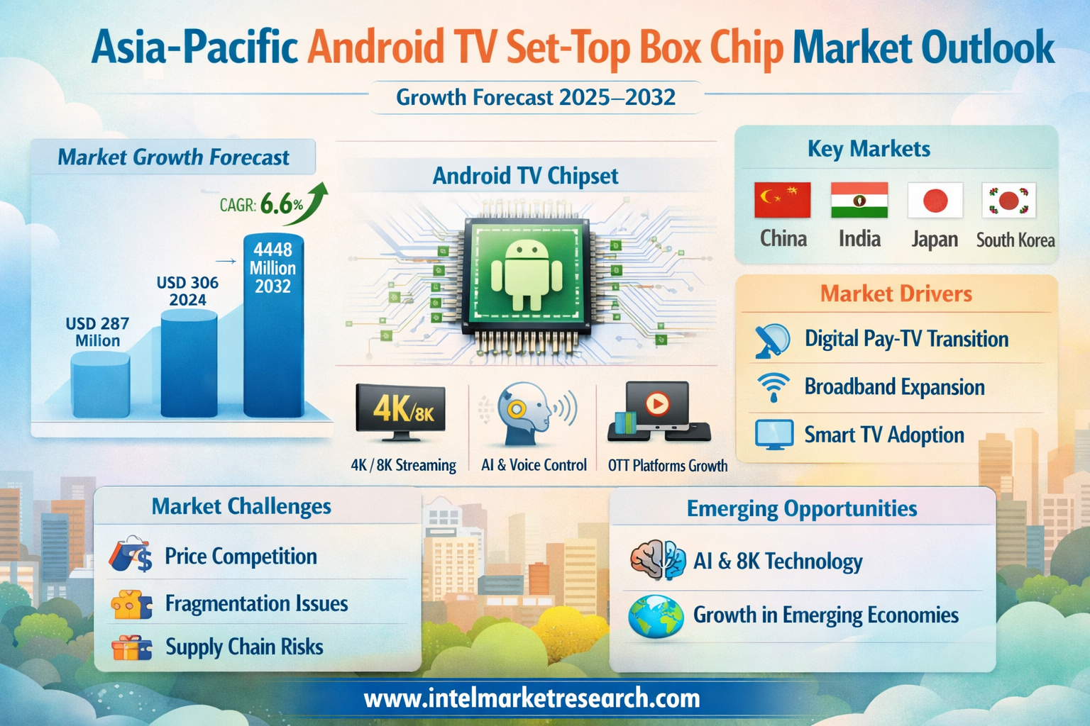 According to a new report from Intel Market Research, the Asia-Pacific Android TV Set-Top Box Chip market was valued at USD 287 million in 2024 and is projected to reach USD 448 million by 2032, growing from USD 306 million in 2025 at a CAGR of 6.6% during the forecast period (2025–2032). This growth is propelled by surging smart TV adoption, expanding broadband infrastructure, and booming OTT platforms in countries like China, India, Japan, and South Korea. Asia-Pacific commands 41% of the global share, fueled by manufacturing hubs and high demand for cost-effective, energy-efficient chipsets.
