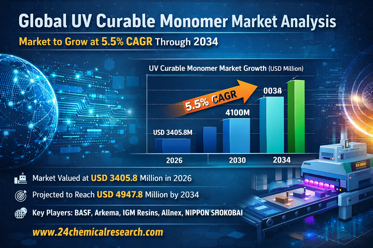 Global UV Curable Monomer market was valued at USD 3405.8 million in 2026 and is projected to reach USD 4947.8 million by 2034, at a CAGR of 5.5% during the forecast period.
