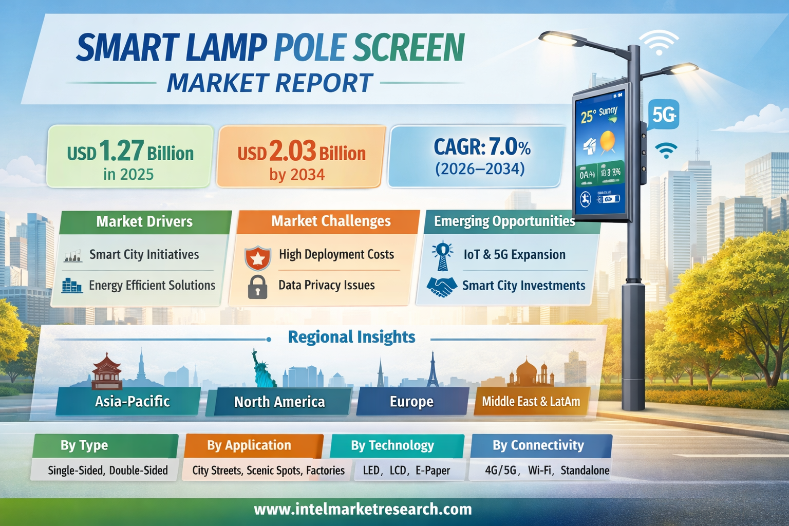 According to a new report from Intel Market Research, the global Smart Lamp Pole Screen market was valued at USD 1.27 billion in 2025 and is projected to reach USD 2.03 billion by 2034, growing at a CAGR of 7.0% during the forecast period (2026–2034). This growth is propelled by increasing urbanization and government investments in smart city projects worldwide, the global push for smart city initiatives with urbanization rates exceeding 65% in developed regions, and advancements in energy-efficient LED and IoT technologies.