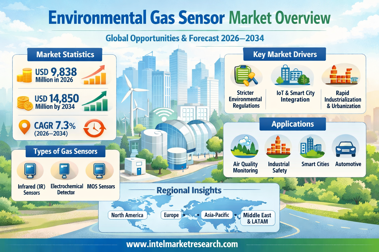 According to a new report from Intel Market Research, the global Environmental Gas Sensor market was valued at USD 9,169 million in 2025 and is projected to grow from USD 9,838 million in 2026 to USD 14,850 million by 2034, exhibiting a CAGR of 7.3% during the forecast period (2026–2034). This growth is propelled by escalating air quality concerns, tightening environmental regulations worldwide, and rapid integration of gas sensors into Internet of Things (IoT) infrastructure and smart city initiatives.