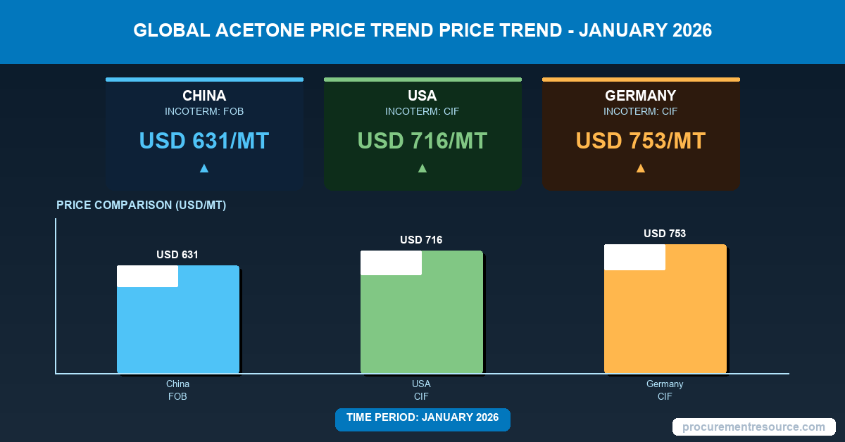 The global in early 2026 reflects a firm upward movement across major markets, driven by tightening supply conditions and steady downstream demand. In January 2026, acetone prices were recorded at USD 631/MT FOB China, USD 716/MT CIF USA, USD 753/MT CIF Germany, USD 740/MT CIF India, and USD 673/MT CIF Japan. By February 2026, prices increased across all tracked regions, reaching USD 670.04/MT FOB China, USD 742.62/MT CIF USA, USD 773.44/MT CIF Germany, USD 762.41/MT CIF India, and USD 705.89/MT CIF Japan. This upward trend highlights the influence of feedstock cost fluctuations, particularly phenol and cumene, alongside improved demand from solvent-intensive industries such as coatings, pharmaceuticals, and electronics cleaning.
