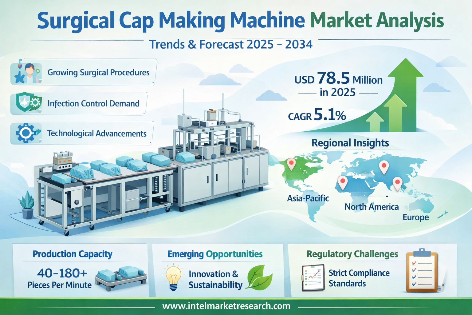 According to a new report from Intel Market Research, the global Surgical Cap Making Machine market was valued at USD 78.5 million in 2025 and is projected to reach USD 125.7 million by 2034, growing at a CAGR of 5.1% during the forecast period (2026–2034). This growth is propelled by increasing surgical procedure volumes globally, heightened infection control awareness post-pandemic, healthcare facility expansion in emerging economies, stringent regulatory requirements for medical textiles, and the shift toward automated production in PPE manufacturing.