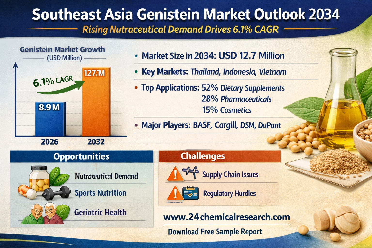Southeast Asia Genistein Market demonstrates robust growth potential, with its valuation reaching USD 8.9 million in 2026. According to the latest industry analysis, the market is projected to expand at a CAGR of 6.1%, reaching approximately USD 12.7 million by 2034. This growth trajectory is primarily fueled by increasing applications in nutraceuticals, pharmaceuticals, and functional food industries, particularly in countries with rapidly evolving healthcare and wellness sectors like Thailand and Singapore.