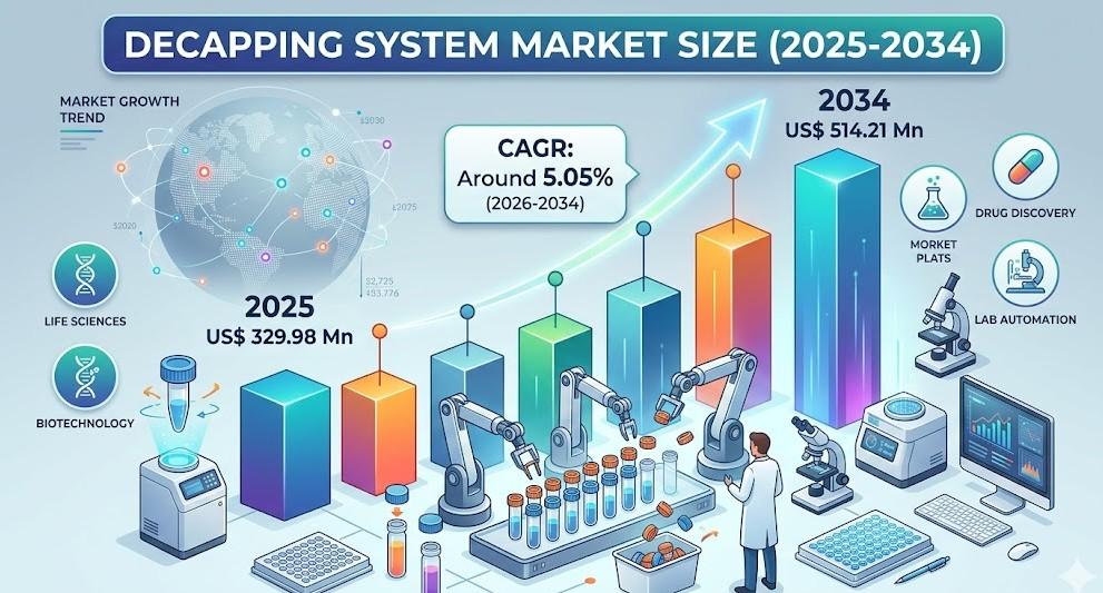 The Decapping System Market Size is projected to grow from US$ 329.98 million in 2025 to US$ 514.21 million by 2034, registering a CAGR of approximately 5.05% during the forecast period. This growth reflects rising demand from pharmaceutical and biotechnology sectors, where automation and high-throughput capabilities are becoming increasingly critical.