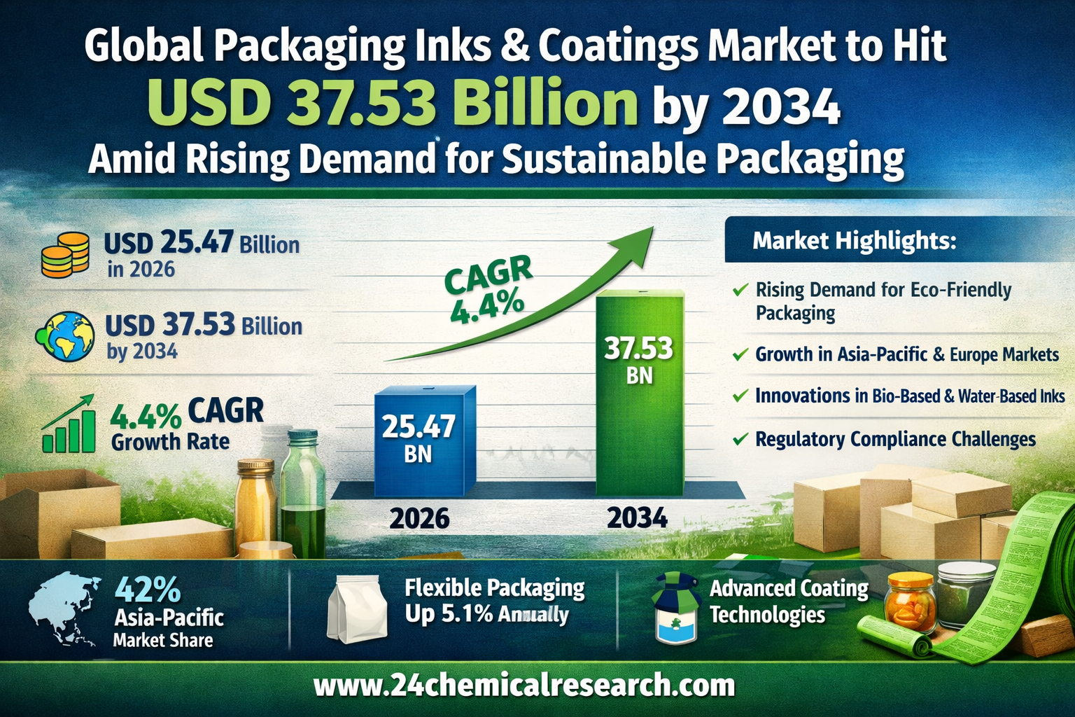 Global Packaging Inks and Coatings Market demonstrates robust expansion, reaching a valuation of USD 25.47 billion in 2026. With increasing demand for sustainable packaging solutions, the market is projected to grow at a CAGR of 4.4%, achieving USD 37.53 billion by 2034. This trajectory reflects the industry’s response to evolving environmental regulations and consumer preferences for eco-friendly materials.
