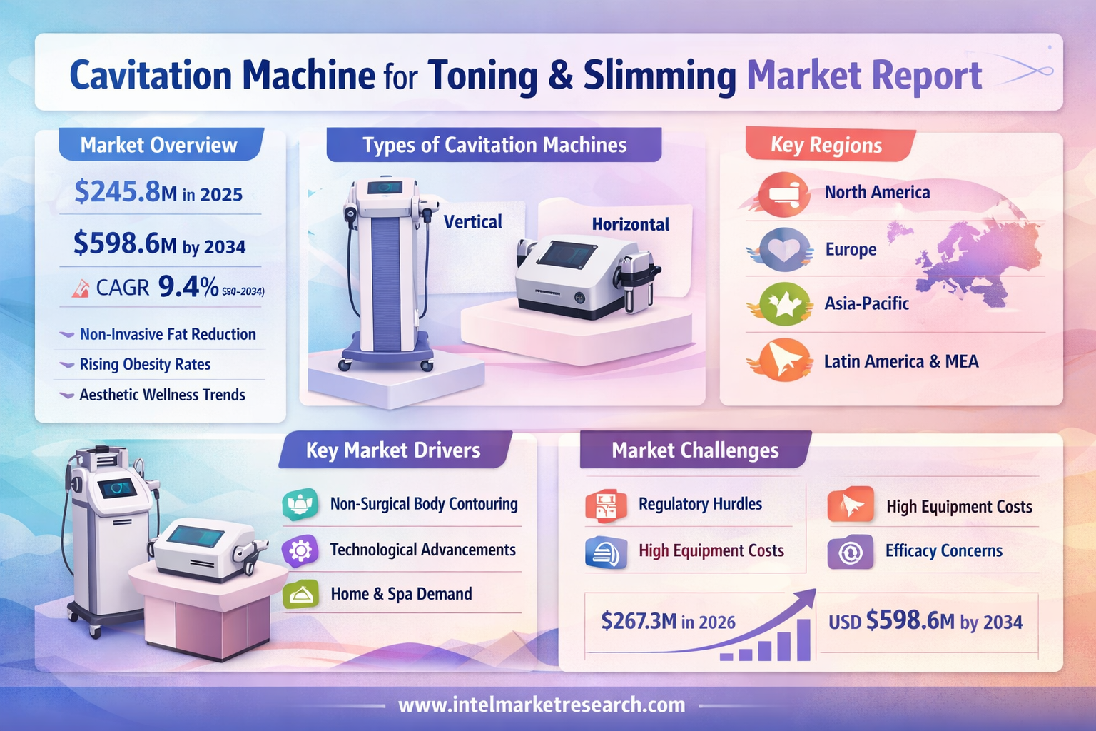 According to a new report from Intel Market Research, the global Cavitation Machine for Toning & Slimming market was valued at USD 245.8 million in 2025 and is projected to grow from USD 267.3 million in 2026 to reach USD 598.6 million by 2034, exhibiting a CAGR of 9.4% during the forecast period (2025–2034). This growth is propelled by rising global obesity rates, increasing consumer preference for non-surgical body contouring solutions, and growing awareness of aesthetic wellness.