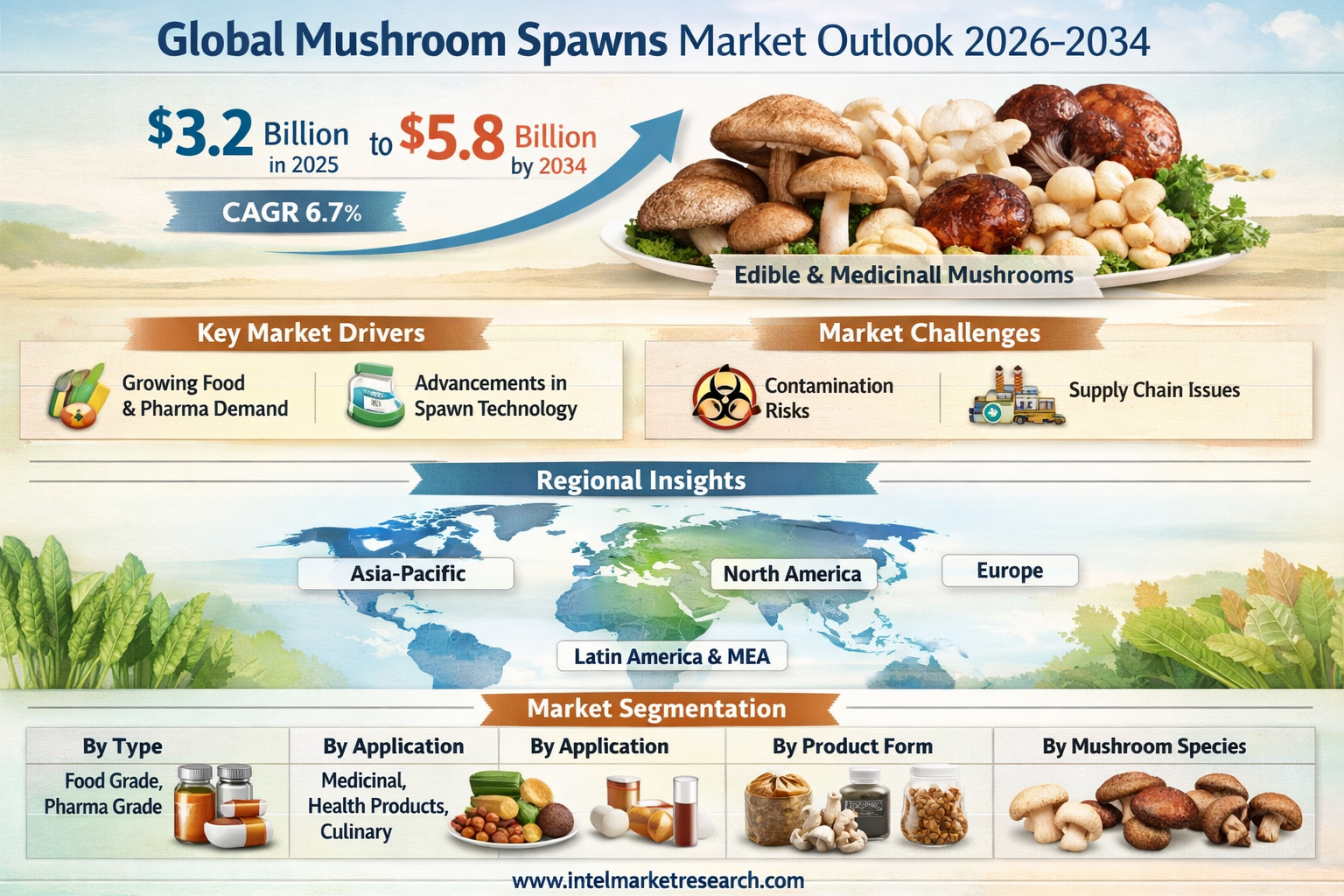 According to a new report from Intel Market Research, the global Mushroom Spawns market was valued at USD 3.2 billion in 2025 and is projected to reach USD 5.8 billion by 2034, growing at a robust CAGR of 6.7% during the forecast period (2026–2034). This growth is propelled by rising health consciousness, expanding vegan populations, and advancements in controlled-environment agriculture technologies.
