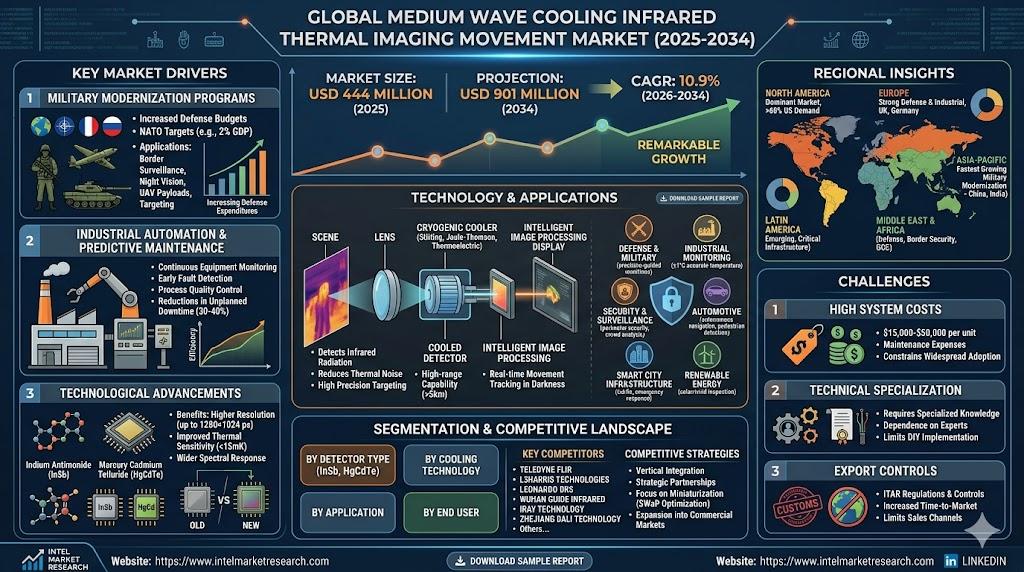 According to a new report from Intel Market Research, the global Medium Wave Cooling Infrared Thermal Imaging Movement market was valued at USD 444 million in 2025 and is projected to reach USD 901 million by 2034, growing at a remarkable CAGR of 10.9% during the forecast period (2026-2034). This substantial growth stems from heightened defense expenditures globally, technological advancements in thermal imaging, and expanding industrial automation needs.