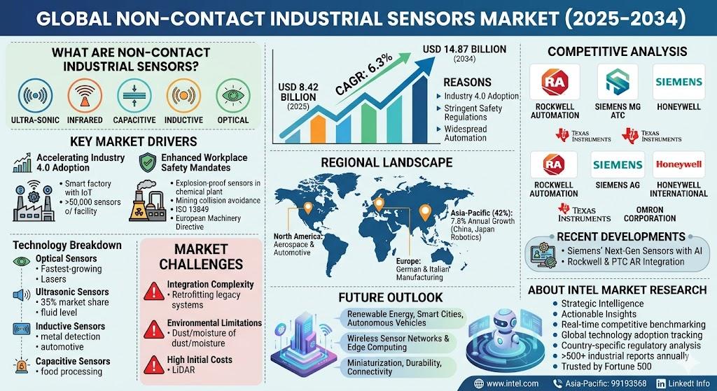 According to a new report from Intel Market Research, the global Non-contact Industrial Sensors market was valued at USD 8.42 billion in 2025 and is projected to reach USD 14.87 billion by 2034, growing at a CAGR of 6.3% during the forecast period (2025–2034). This growth is driven by increasing industrial automation, stringent safety regulations, and widespread adoption of Industry 4.0 technologies across manufacturing sectors.