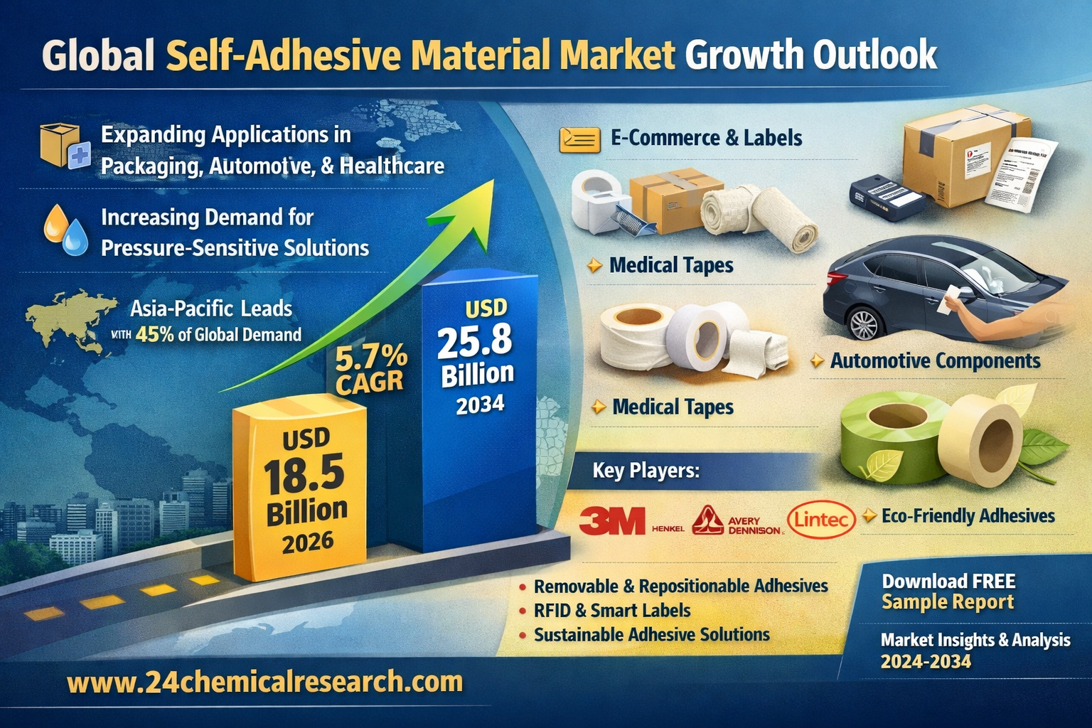 Global Self-adhesive Material market continues its robust expansion, with latest market analyses estimating its valuation at USD 18.5 billion in 2026. Industry projections indicate a steady 5.7% CAGR through 2034, when the market is expected to surpass USD 25.8 billion. This growth trajectory is anchored in expanding applications across packaging, automotive, and healthcare sectors, where pressure-sensitive solutions are increasingly preferred for their versatility and cost-efficiency.