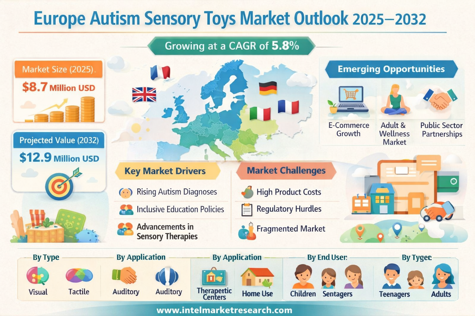 According to a new report from Intel Market Research, the Europe Autism Sensory Toys market was valued at USD 8.2 million in 2024 and is projected to grow from USD 8.7 million in 2025 to USD 12.9 million by 2032, exhibiting a CAGR of 5.8% during the forecast period (2025–2032). This growth is propelled by rising ASD awareness, robust inclusive education policies, increasing diagnoses across countries like the UK, Germany, and France, government-funded therapeutic programs, emphasis on early intervention, and advancements in sensory integration therapies.