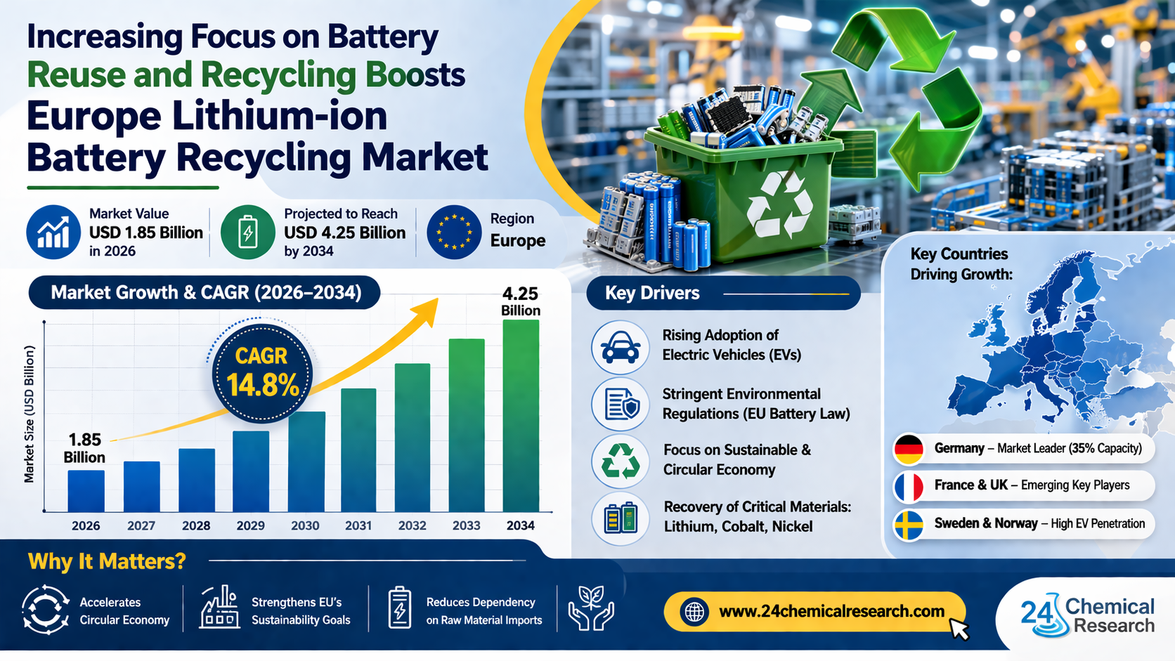 Europe Lithium-ion Battery Recycling Market is witnessing unprecedented growth, with its valuation reaching USD 1.85 billion in 2026. According to the latest market analysis, the sector is projected to expand at a CAGR of 14.8%, reaching approximately USD 4.25 billion by 2034. This surge is primarily driven by the rising adoption of electric vehicles (EVs), stringent environmental regulations, and the increasing focus on sustainable battery disposal solutions.