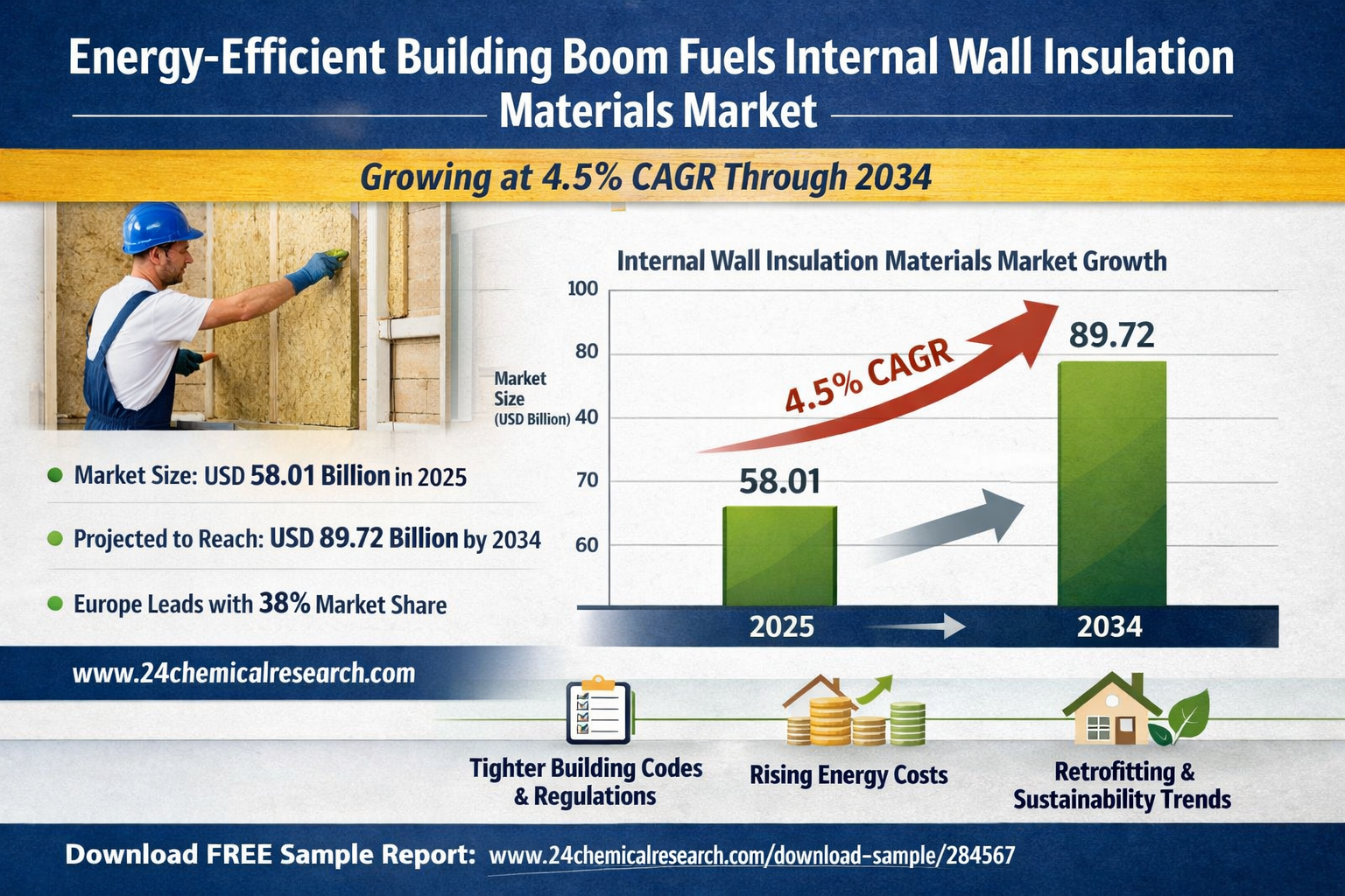 Energy-Efficient Building Boom Fuels Internal Wall Insulation Materials Market, Growing at 4.5% CAGR Through 2034Global internal wall insulation materials market size was valued at USD 58.01 billion in 2025 and is projected to reach USD 89.72 billion by 20