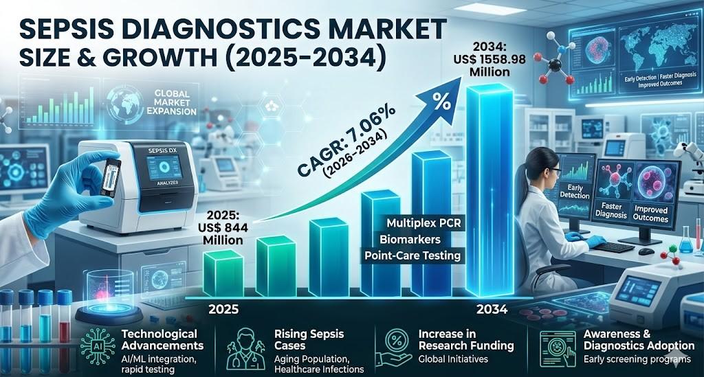 The Sepsis Diagnostics Market Size is projected to expand significantly, increasing from US$ 844 million in 2025 to US$ 1558.98 million by 2034. This reflects a steady compound annual growth rate of 7.06% during the forecast period 2026 to 2034. Growth is strongly supported by rising cases of hospital-acquired infections, increasing antimicrobial resistance, and growing demand for rapid diagnostic solutions that reduce time to treatment.