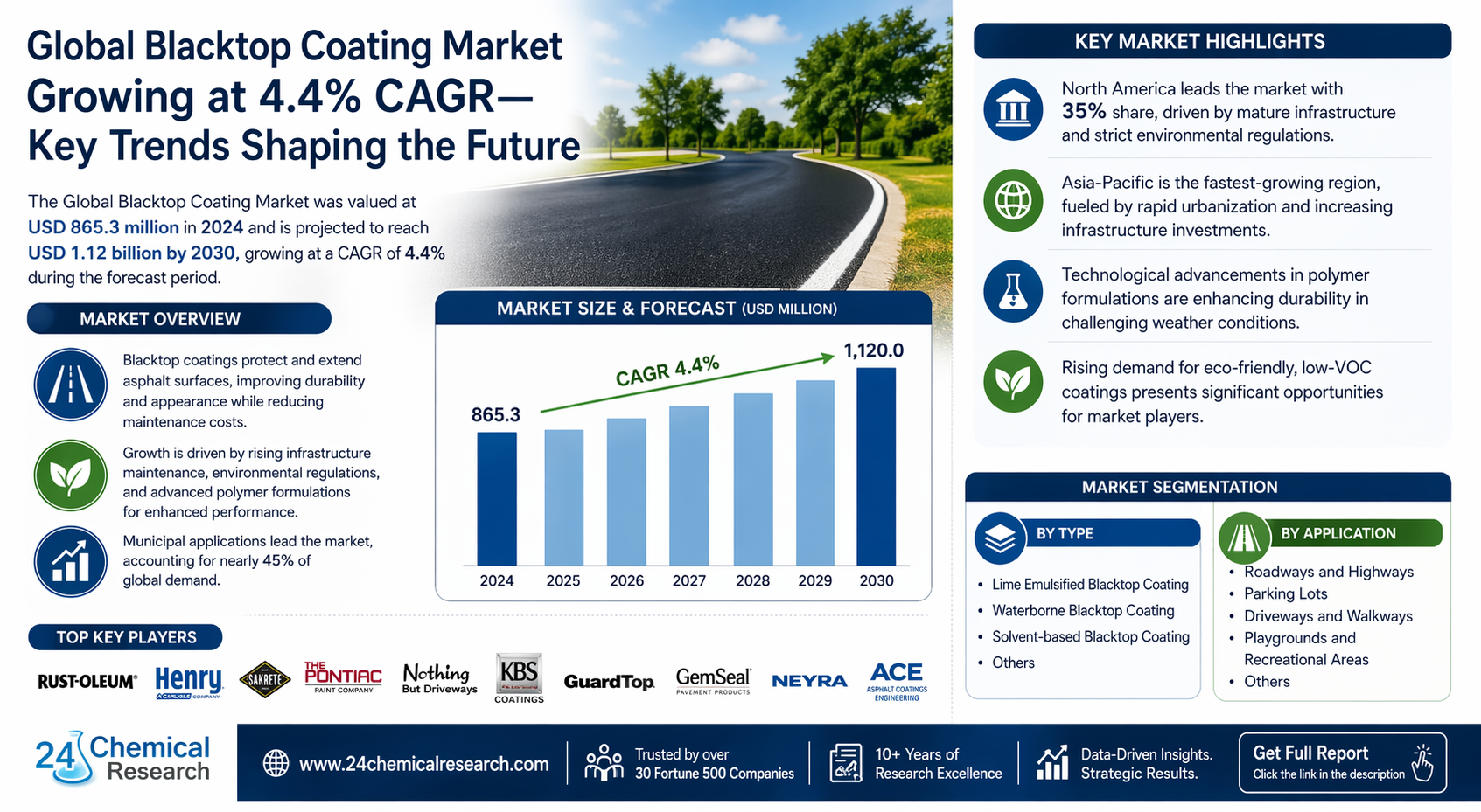 Global Blacktop Coating market continues to demonstrate steady expansion, with its valuation reaching USD 865.3 million in 2024. According to the latest industry analysis, the market is projected to grow at a CAGR of 4.4%, reaching approximately USD 1.12 billion by 2030. This growth trajectory is largely fueled by increasing infrastructure maintenance requirements, environmental regulations, and the development of advanced polymer formulations that enhance durability in challenging weather conditions.