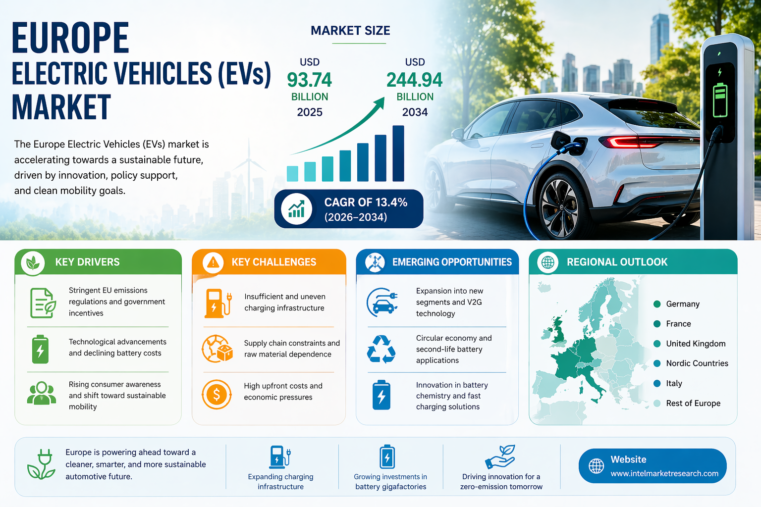 According to a new report from Intel Market Research, the Europe Electric Vehicles (EVs) market was valued at USD 93.74 billion in 2025 and is projected to reach USD 244.94 billion by 2034, growing at a robust CAGR of 13.4% during the forecast period (2026–2034). This growth is propelled by stringent EU emissions regulations, rising government incentives for zero-emission mobility, increasing consumer awareness of climate change impacts, and growing investments in charging infrastructure and battery gigafactories across countries like Germany and Sweden.