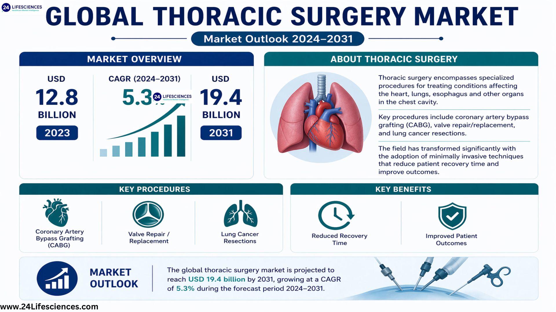 According to a newly published market research report by 24LifeSciences, global thoracic surgery market was valued at USD 12.8 billion in 2023 and is projected to reach USD 19.4 billion by 2031, growing at a compound annual growth rate (CAGR) of 5.3% during the forecast period 20242031.