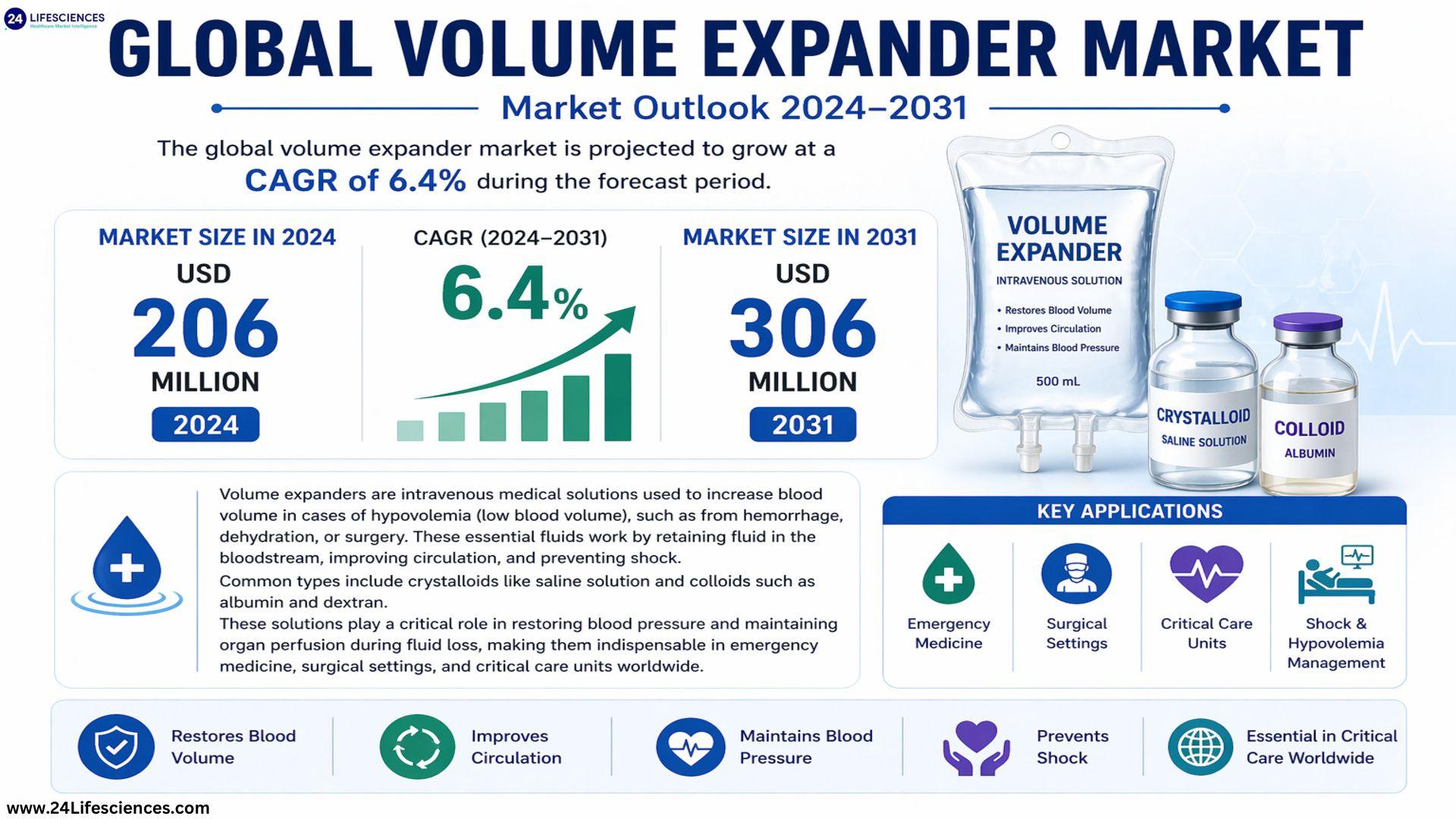 According to a newly published market research report by 24LifeSciences, global volume expander market was valued at USD 206 million in 2024 and is projected to reach USD 306 million by 2031, growing at a compound annual growth rate (CAGR) of 6.4% during the forecast period.