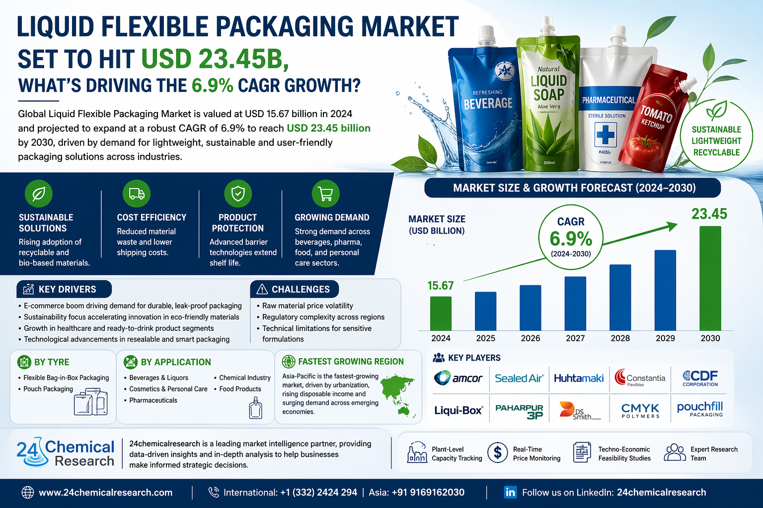 Global Liquid Flexible Packaging Market represents a dynamic and rapidly evolving sector, currently valued at USD 15.67 billion in 2024 and projected to expand at a robust CAGR of 6.9% to reach USD 23.45 billion by 2030. This market segment thrives on innovation across industries from beverages to pharmaceuticals, driven by consumer demand for lightweight, sustainable and user-friendly packaging solutions.