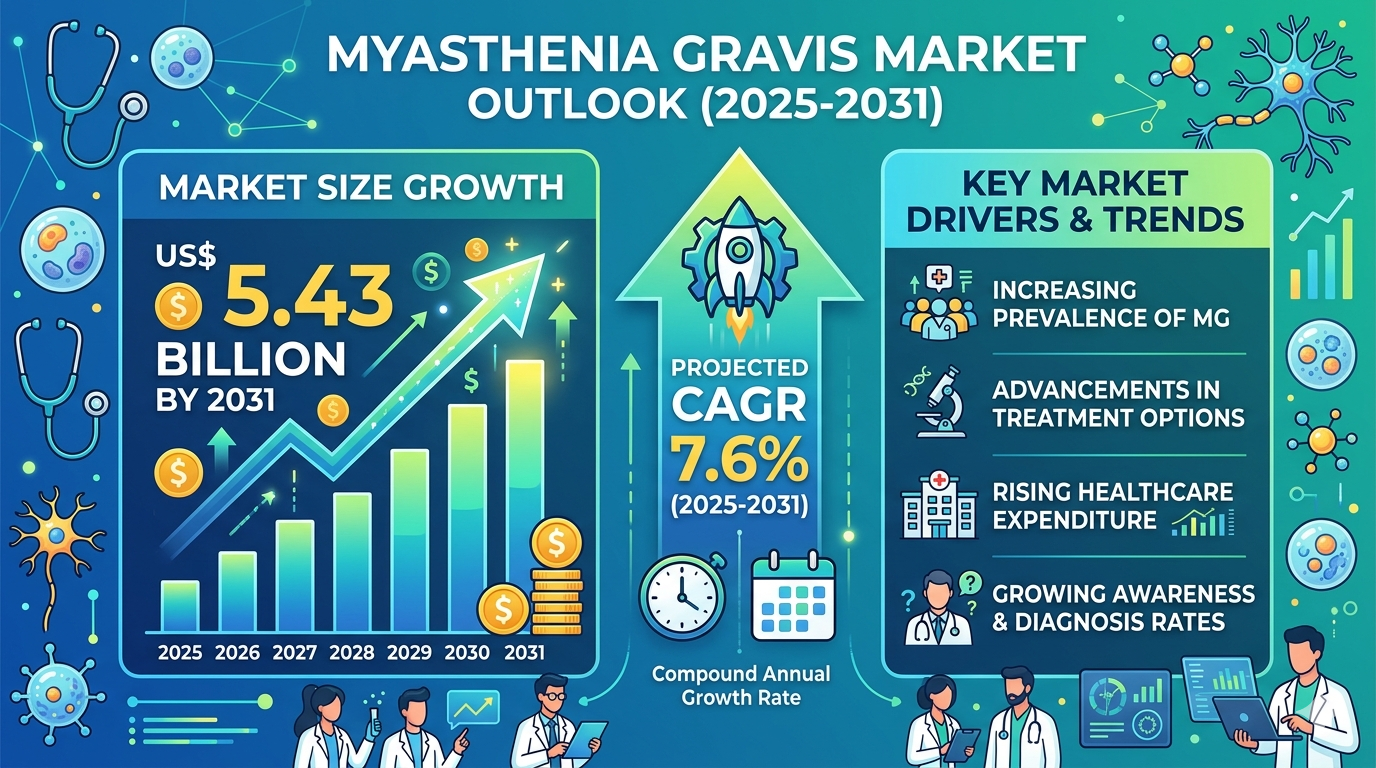 The Myasthenia Gravis Market size is expected to reach US$ 5.43 Billion by 2031. The market is anticipated to register a CAGR of 7.6% during 2025–2031. This steady growth is driven by the increasing prevalence of autoimmune disorders, rising healthcare investments, and expanding access to advanced treatment options. Additionally, the growing focus on early diagnosis and effective disease management is contributing to the expansion of therapeutic solutions for myasthenia gravis.