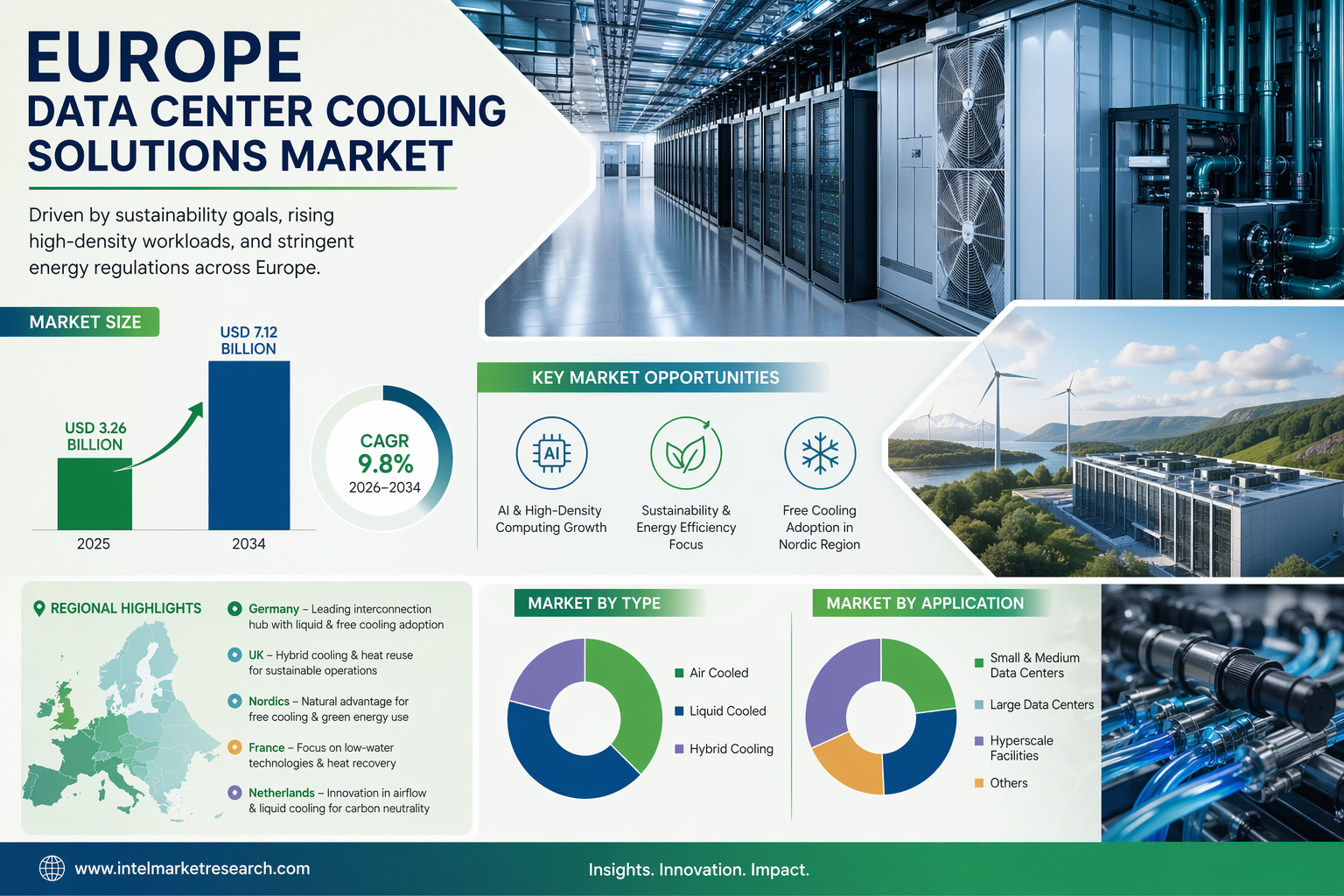 According to a new report from Intel Market Research, the Europe Data Center Cooling Solutions market was valued at USD 3.26 billion in 2025 and is projected to reach USD 7.12 billion by 2034, growing at a robust CAGR of 9.8% during the forecast period (2026–2034). This growth is propelled by the region's strong focus on sustainability and stringent energy efficiency regulations, such as the EU Energy Efficiency Directive and the Climate Neutral Data Centre Pact, the proliferation of high-density computing particularly from AI workloads and hyperscale expansions, as well as the favorable climate in Nordic countries driving significant investment in free cooling solutions.