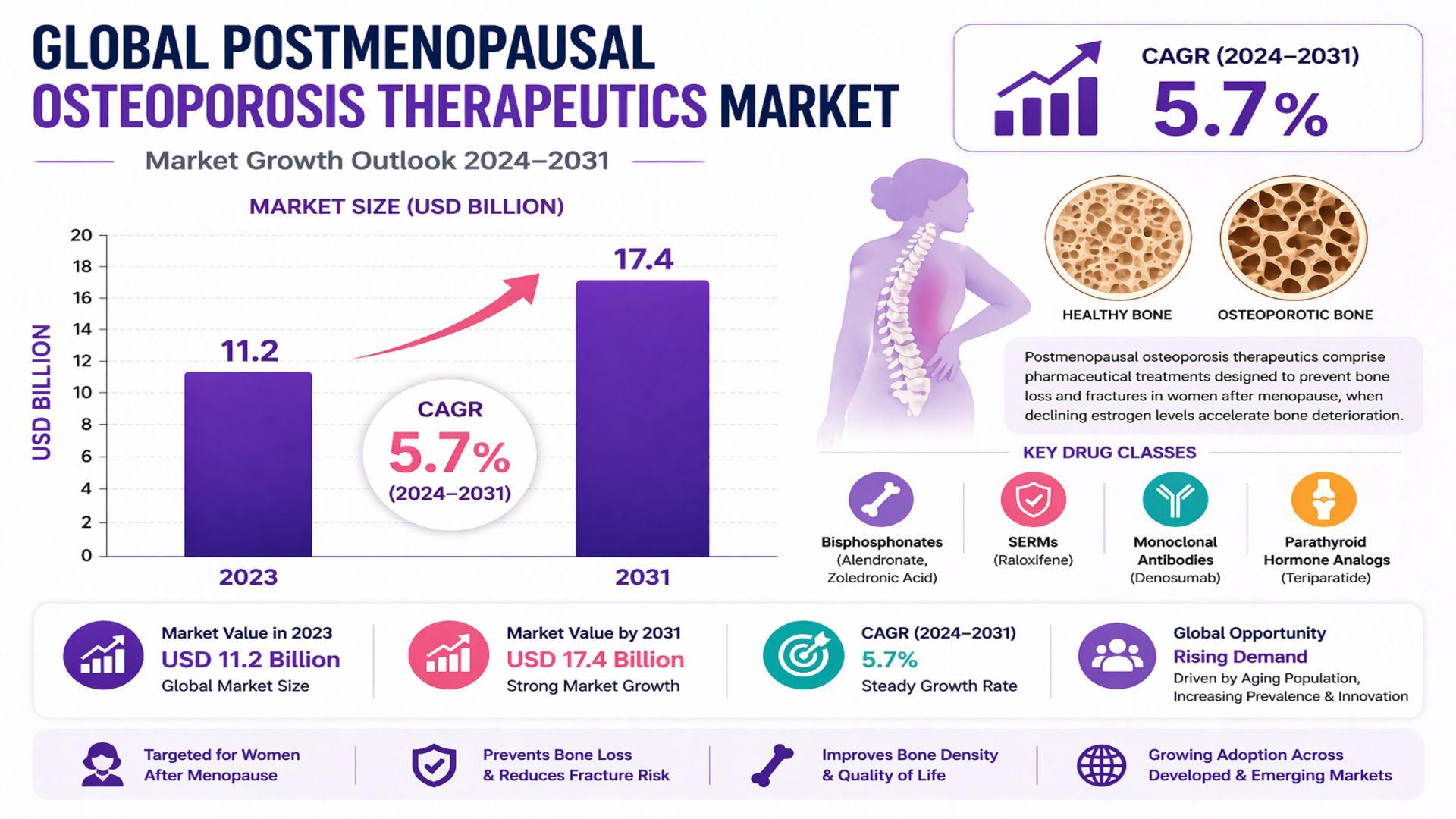 Global postmenopausal osteoporosis therapeutics market growth outlook with 5.7% CAGR (2024–2031)