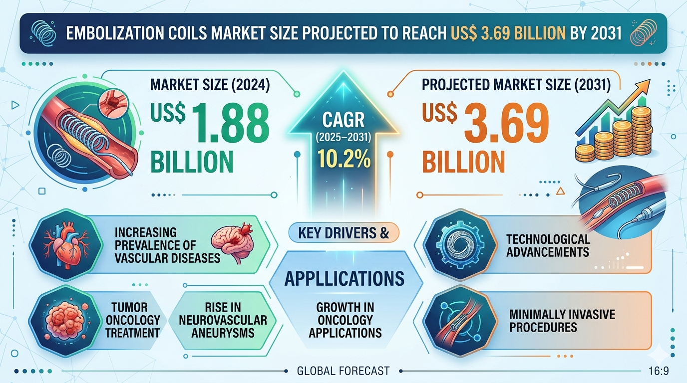The Embolization Coils Market size is projected to reach US$ 3.69 billion by 2031 from US$ 1.88 billion in 2024. The market is expected to register a CAGR of 10.2% during 2025–2031. The increasing adoption of image-guided and minimally invasive procedures is a primary driver of this growth. Additionally, favorable reimbursement policies in developed economies and the modernization of healthcare systems in the Middle East are supporting market expansion.