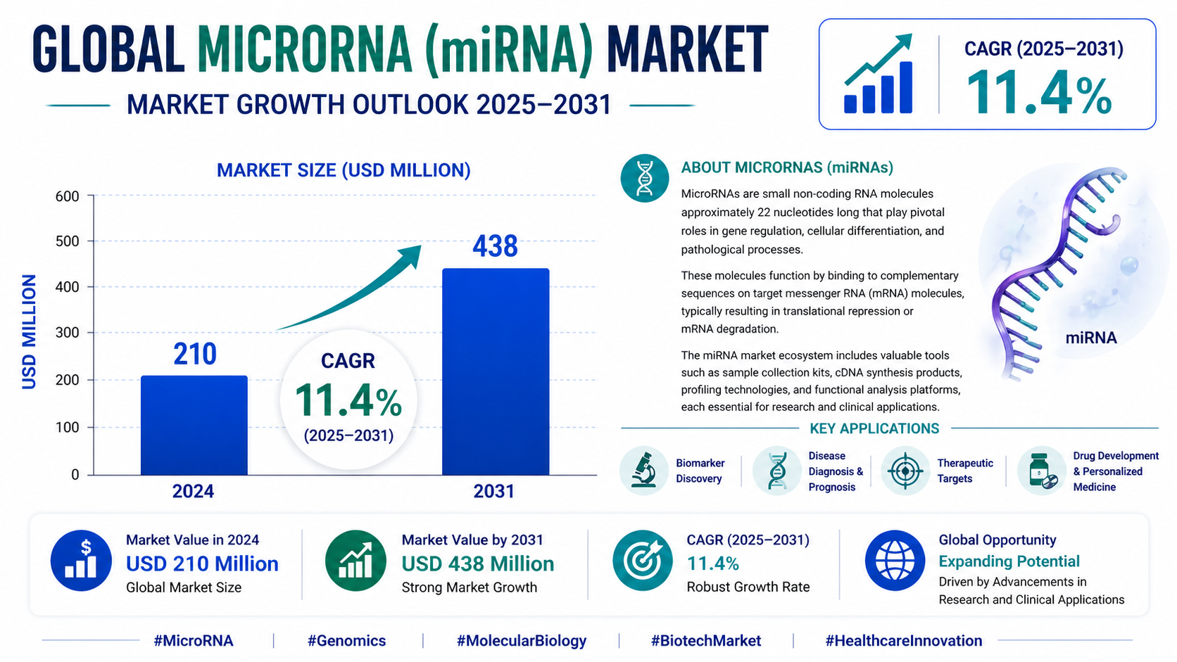 According to a newly published market research report by 24LifeSciences, global MicroRNA (miRNA) market was valued at USD 210 million in 2024 and is projected to reach USD 438 million by 2031, growing at a compound annual growth rate (CAGR) of 11.4% during the forecast period 2025-2031.
