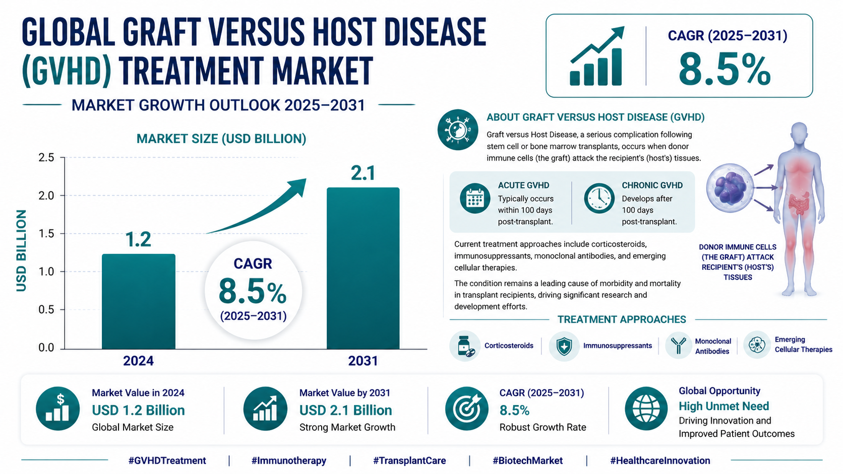 According to a newly published market research report by 24LifeSciences, global Graft Versus Host Disease (GVHD) Treatment market was valued at USD 1.2 billion in 2024 and is projected to reach USD 2.1 billion by 2031, growing at a compound annual growth rate (CAGR) of 8.5% during the forecast period 20252031.