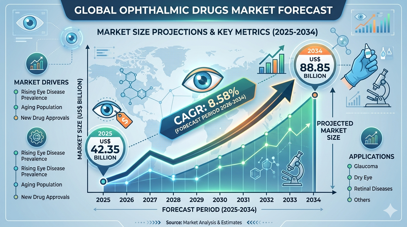 The global Ophthalmic Drugs Market size is projected to reach US$ 88.85 billion by 2034 from US$ 42.35 billion in 2025. The market is anticipated to register a CAGR of 8.58% during the forecast period 2026–2034. This robust growth trajectory is driven by increasing incidences of chronic eye diseases, rising healthcare spending, and expanding access to advanced treatment options. Pharmaceutical companies are focusing on the development of innovative drugs, including biologics and combination therapies, to address unmet clinical needs and improve patient compliance across diverse populations.