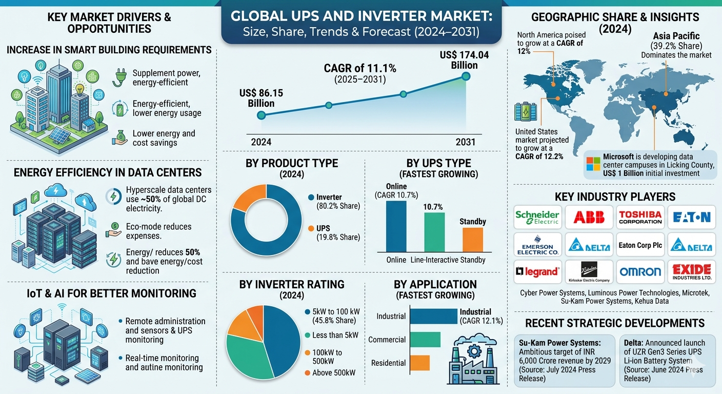 The UPS and Inverter Market Valued at US$ 86.15 billion in 2024 and is expected to reach US$ 174.04 billion by 2031, registering a CAGR of 11.1% from 2025 to 2031.