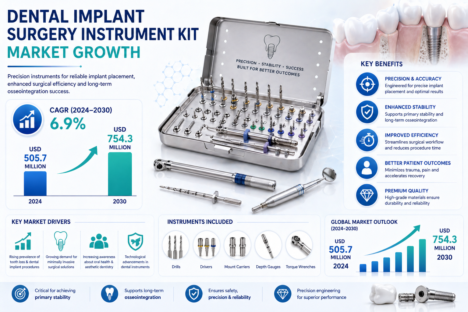 According to a newly published market research report by 24LifeSciences, global dental implant surgery instrument kit market was valued at USD 505.7 million in 2024 and is projected to reach USD 754.3 million by 2030, growing at a compound annual growth rate (CAGR) of 6.9% during the forecast period 2024–2030.