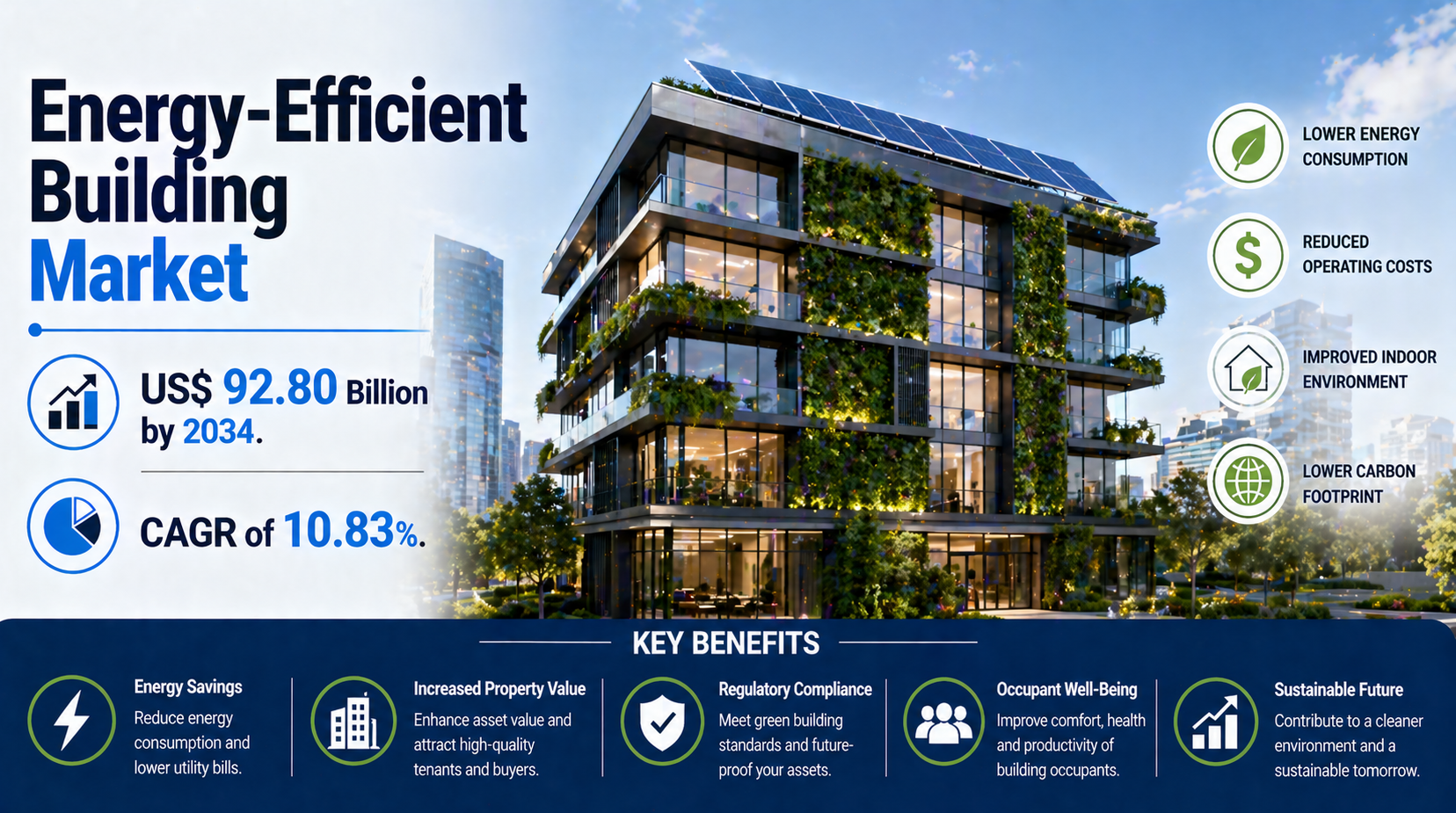 According to market research, the Energy-Efficient Building Market is expected to reach US$ 92.80 Billion by 2034 from US$ 36.79 Billion in 2025. The market is anticipated to register a CAGR of 10.83% during the forecast period 2026–2034.