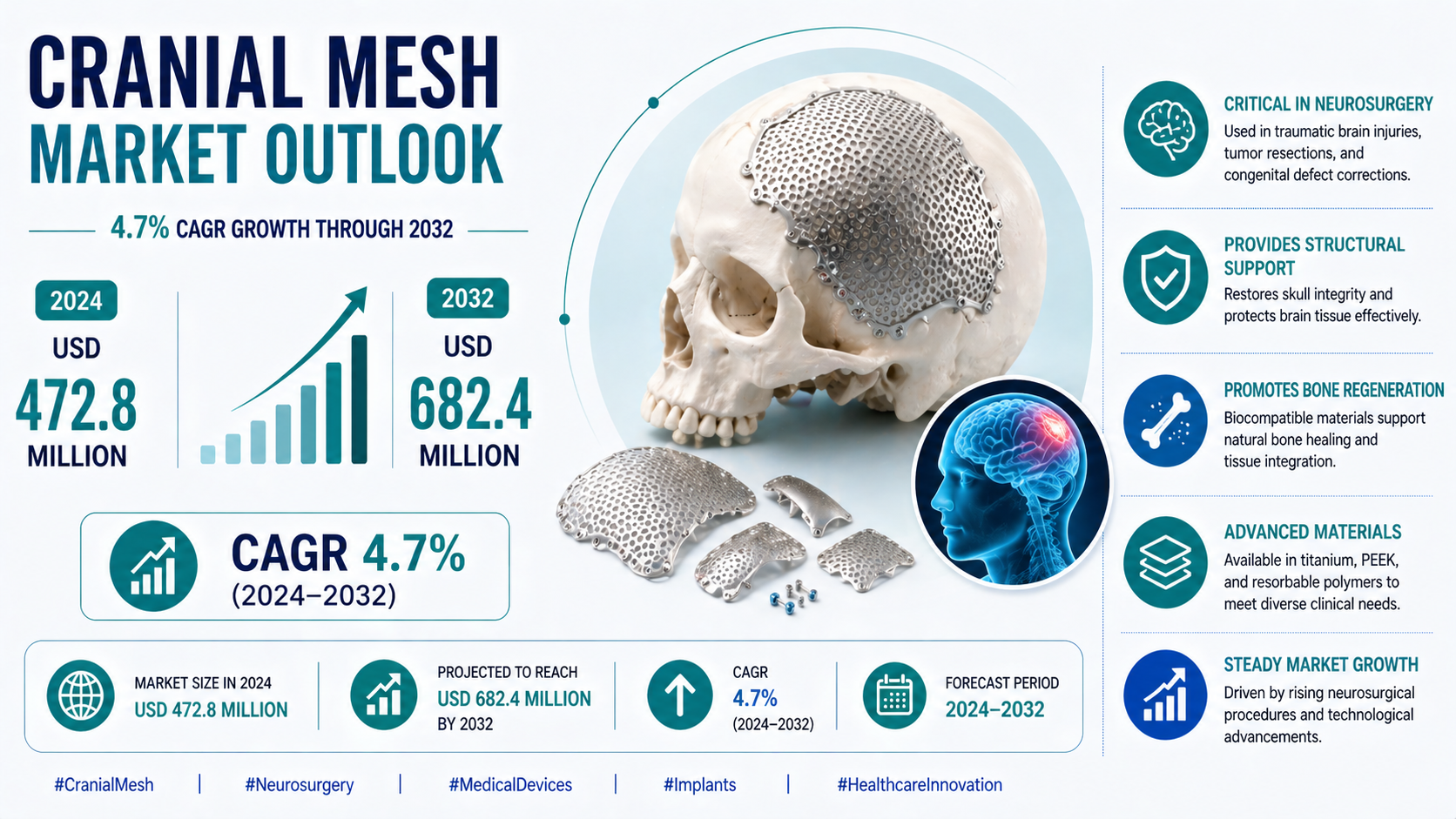 According to a newly published market research report by 24LifeSciences, global cranial mesh market was valued at USD 472.8 million in 2024 and is projected to reach USD 682.4 million by 2032, growing at a compound annual growth rate (CAGR) of 4.7% during the forecast period 2024–2032.