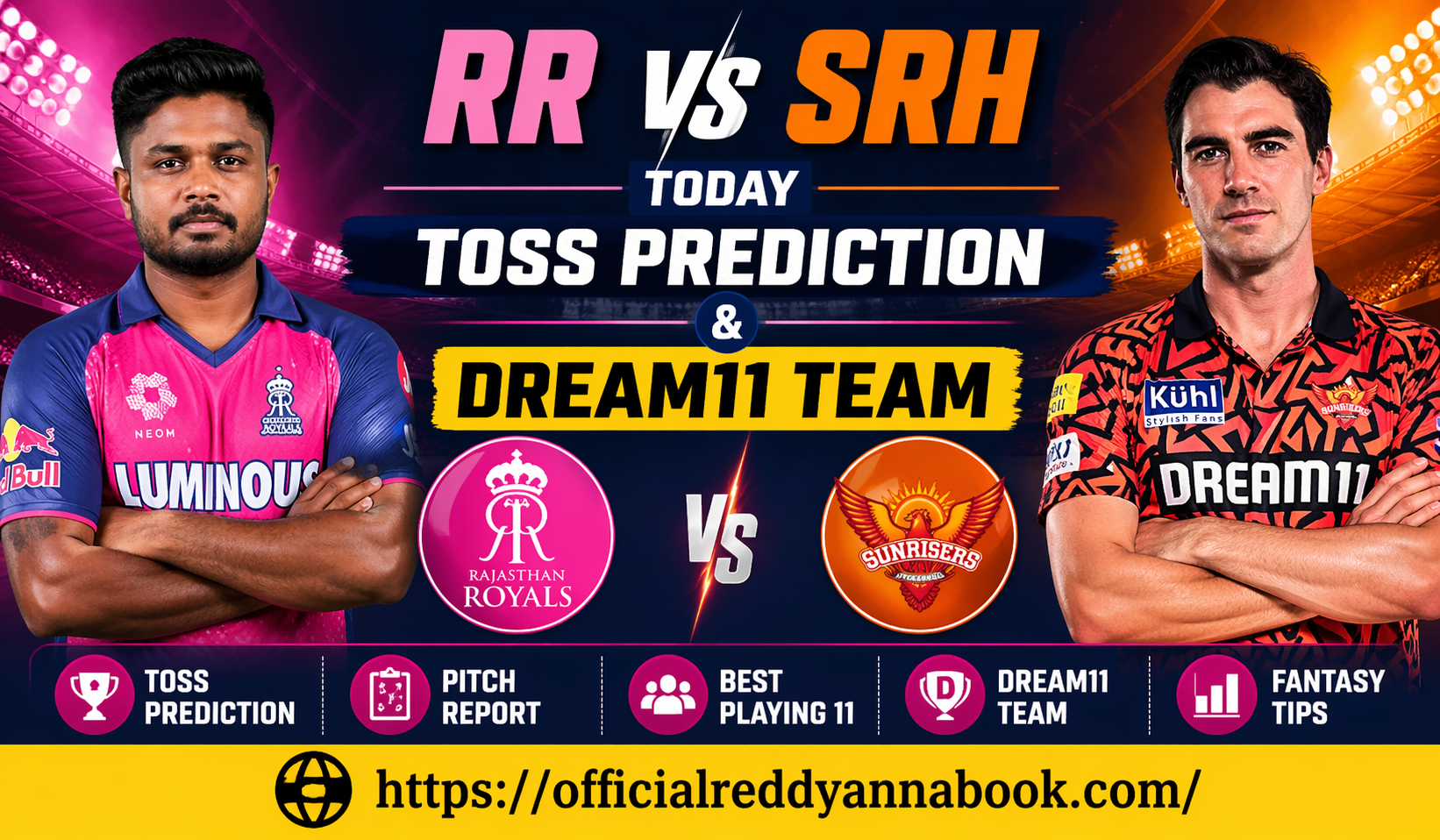 RR vs SRH Today Toss Prediction & Dream11 Team brings you quick match insights, probable toss winner analysis, pitch report, and smart captain and vice-captain picks for fantasy teams. Stay updated with expert match previews and winning strategies with Reddy Anna Book for today’s IPL 2026 clash between Rajasthan Royals and Sunrisers Hyderabad.