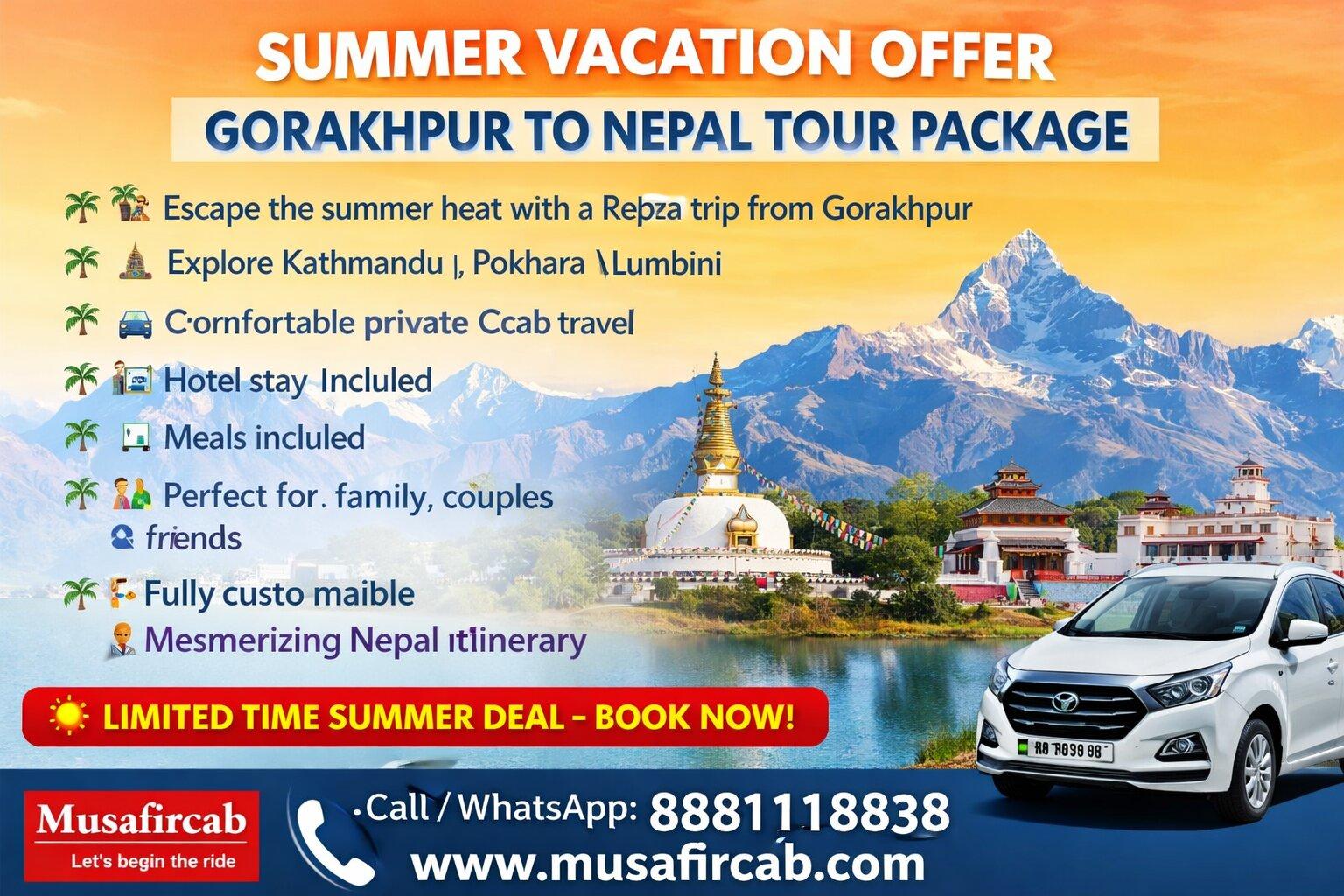 ☀️🏔️ Summer Vacation Special – Gorakhpur to Nepal Tour Package 🇳🇵✨ This summer, escape the heat and enjoy a refreshing trip to the beautiful Himalayas. Nepal is just a short drive from Gorakhpur, making it the perfect destination for a quick international getaway with family and friends. Travel with Musafircab and grab our special summer vacation offer on Gorakhpur to Nepal tour packages. Explore the spiritual charm of Kathmandu, the scenic beauty of Pokhara, and the peaceful atmosphere of Lumbini. Our package includes comfortable cab travel, hotel stay, meals, and sightseeing, so you can enjoy a hassle-free holiday and create unforgettable memories. 🎉 Limited Time Summer Offer – Book Your Trip Now! https://www.musafircab.com/page/gorakhpur-to-nepal-tour-package